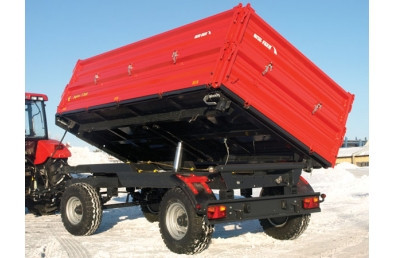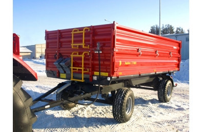 Двухосевый прицеп T710/2 ёмкостью 8 т обладает лёгкой и солидной конструкцией, основанной, главным образом, на замкнутых профилях. Нижняя и верхняя рама изготовленные из стали S355 ( 18G2A), что гарантирует стойкость на протяжении долгих лет потребления. Характеризуется низким уровнем пола по отношению к грунту, что облегчает загрузку. Стены ящика сделано из бортовых профилей известной марки Fuhrmann. Обеспечивают они совершенную жесткость и непроницаемость конструкции. Ящик основан на системе шарниров, позволяющей на её трёхсторонний свал. Дополнительно в задней стене, стандартно находится заслонка с желобом, предназначена для разгрузки сыпучих материалов. Стандартно к каждому прицепу добавлены наездные клины для колёс. По специальному пожеланию клиента можно снабдить прицеп запасным колесом, с крепежом под нижней рамой, заднюю сцепку, а также стеллажом вместе с брезентовой покрышкой. Прицеп может быть также платформой, после разборки стен и столбиков. Превосходно годится к транспортировке небольшого количества рулонов соломы, ящиков или поддонов. Пол T710/1 изготовленный из обычной стали S255 толщиной 4 мм, покрытый высокого качества лаковым покрытием, которое защищает от деформаций и коррозии. Прицеп изготовлен согласно с директивами ЕС и обладает сертификатом ЕС. Стандартно оснащен однопроводным пневматическим тормозом. С целью облегчения ежедневного употребления прицеп обладает системой центральной блокировки стен у края пола. Стандартное оснащение лестницей облегчает ежедневное использование машины. С целью сохранения жесткой конструкции после загрузки применено трос, стабилизирующий стены, которые опускается тягачом на боковой стене. Для защиты оператора перед падением ящика во время сервиса прицепы применено механическую защиту в виде подпоры загрузочного ящика.
